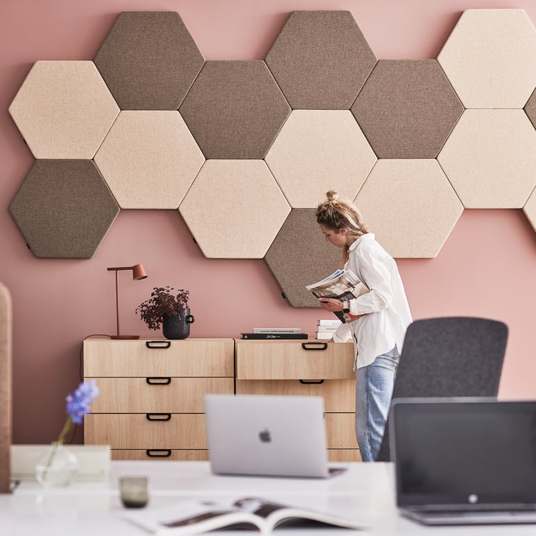 Łatwym sposobem na stworzenie przyjemniejszego środowiska akustycznego, zwłaszcza w otwartych przestrzeniach biurowych, jest zastosowanie pochłaniaczy dźwięku. Zapewnia to również możliwość włączenia koloru i kształtu w naturalny sposób.