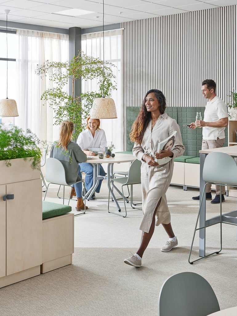 Dzięki obszarom coworkingowym w miejscu pracy współpracownicy mogą korzystać ze wspólnych przestrzeni zarówno do przerw na kawę, jak i do pracy, relaksu i spotkań. W ten sposób obszar nie jest przeznaczony tylko do jednej rzeczy. Dzięki miejscom do siedzenia na różnych wysokościach wnętrze staje się dynamiczne i zachęcające.